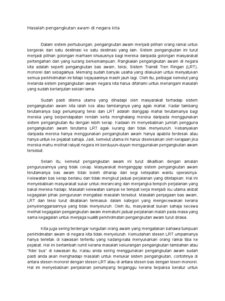 Walaupun kita sering membaca begitu banyak tulisan berkenaan huraian masalah pengangkutan di Malaysia tetapi isu ini masih. Esei Pengajian Am Pengangkutan Awam.