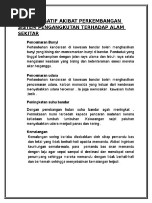 Melalui pemerhatian saya dapati bahawa pengangkutan awam telah meningkatkat pencemaran udaradi kawasan kajianLebih-lebih lagi pengangkutan awam bas menggunakan minyak diesel yang menyebabkan bas mengelurkan asap yang lebih banyak. Sudah tentu rakyat Malaysia menginginkan satu sistem pengangkutan yang lancar dan kurang bermasalah. Kurang pengetahuan agamamoral 17 f KOLEKSI ESEI PERCUBAAN 2012-2014 STPM PENGGAL 1 Ibu bapa kurang pengetahuan agama atau tidak menitik beratkan ajaran agama.