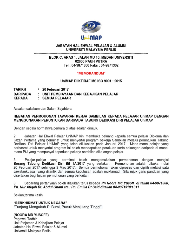 Anda boleh buat semakan surat tawaran di laman web universiti awam UA masing-masing termasuk di portal UNIMAS UMS UTEM UTHM UMP UMK USM UPSI UMT Unimap UPNM UM UPM UTM UKM UITM UIA UUM USIM yang kami kongsikan seperti di bawah ini. Selasa 9 Mac Majlis Perwakilan from ipsisuitmedumy 1 perkara borang permohonan lengkap dan telah diperaku oleh penyelia ketua pusat serta disokong oleh dekan pengarah. Hebahan permohonan tawaran kerja sambilan kepada pelajar unimap dengan menggunakan peruntukan daripada tabung dedikasi diri pelajar unimap.