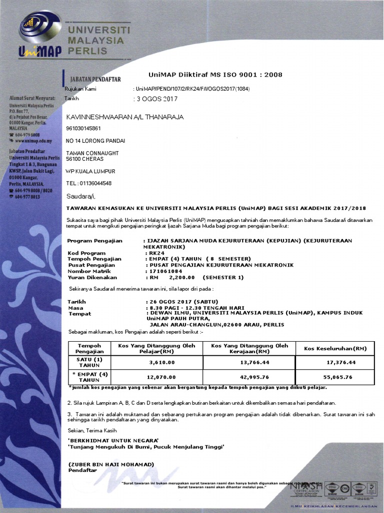 Sistem surat tawaran universiti malaysia perlis. Surat tawaran ini sah sehingga tarikh pendaftaran yang dinyatakan. UniMAPjuga berhak menarik balik tawaran ini tanpa memberikan sebarang sebab.